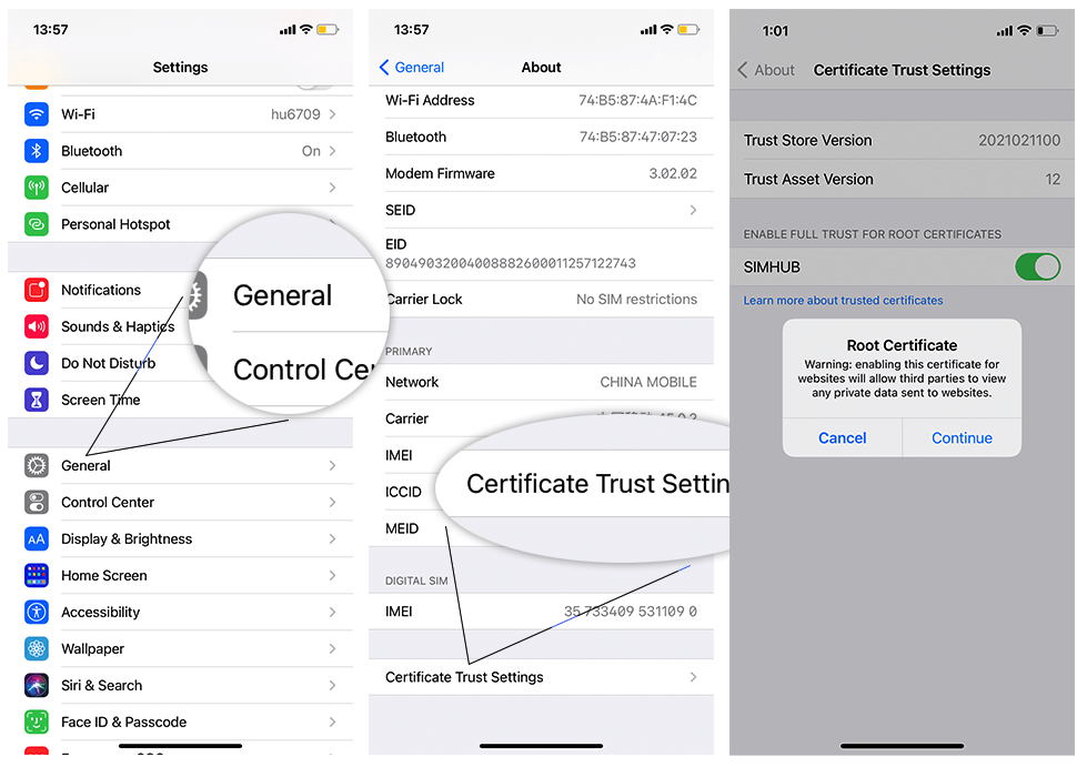 Vào Cài đặt -> Chung -> Giới thiệu -> Cài đặt tin cậy chứng chỉ