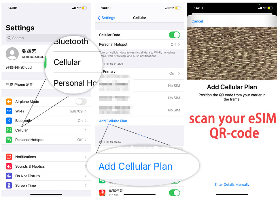 - Vào Cài đặt > Di động > Thêm eSIM > Quét mã QR ở mục (1)